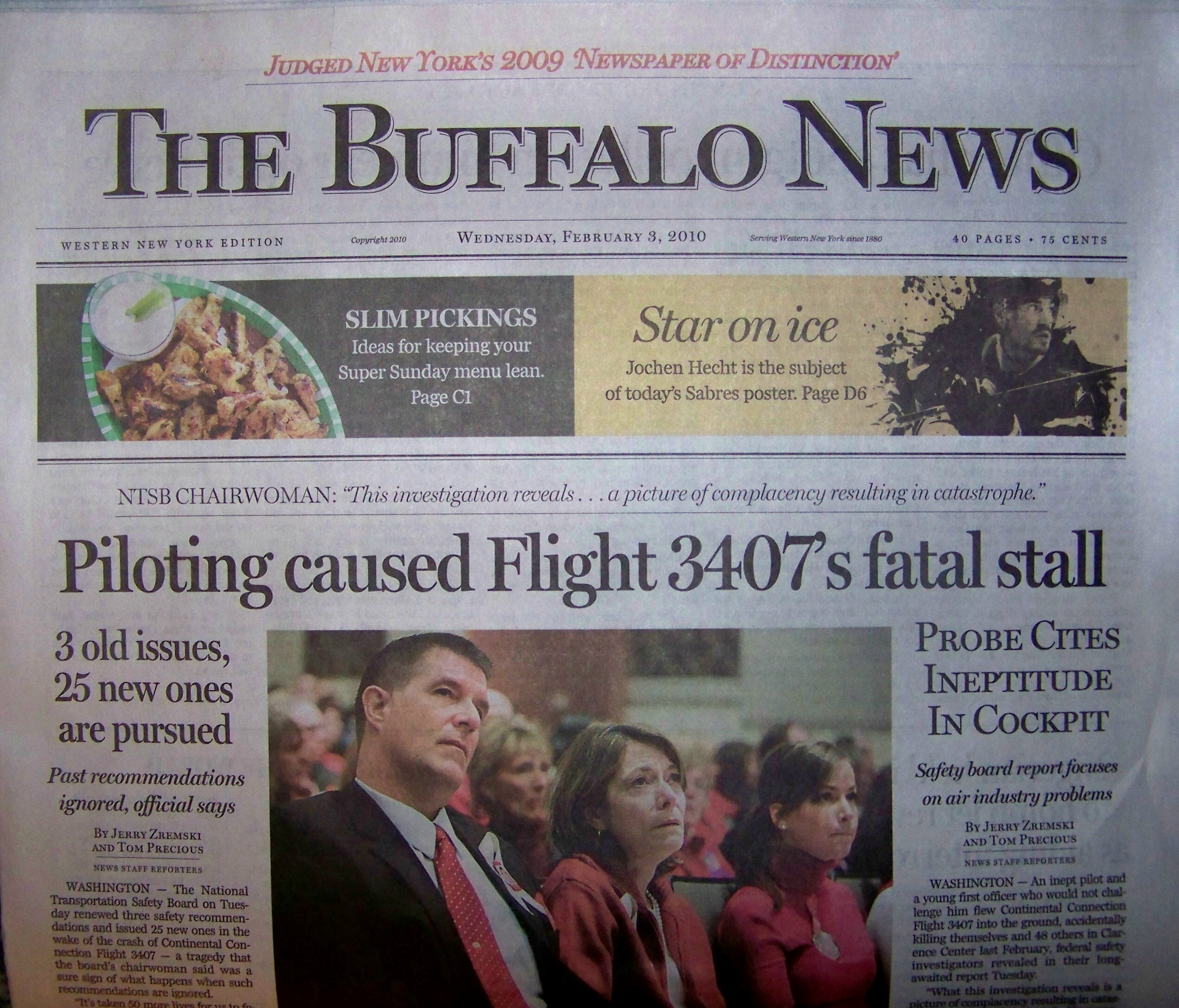 “An inept pilot and a young first officer who would not challenge him flew Continental Connection Flight 3407 into the ground, accidentally killing themselves and 48 others in Clarence Center last February, federal safety investigators revealed in their long-awaited report Tuesday (Feb. 2). …. ‘What this investigation reveals is a picture of complacency resulting in catastrophe,” said Deborah A.P. Hersman, chairwoman of the National Transportation Safety Board.