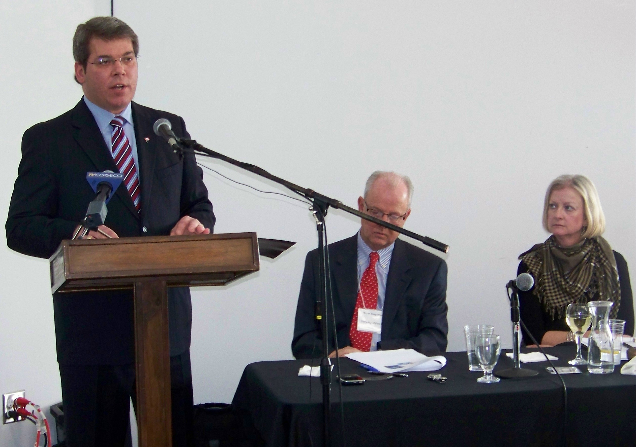 Port Colborne Mayor Vance Badawey addresses annual south Niagara mayors' summit as Fort Erie Mayor Doug Martin and Wainfleet Mayor Barbara Henderson listen on. Photo by Doug Draper