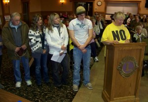 Reilly's grandfather, John Kennedy, her aunt Marnie Kennedy, mother Denise Kennedy and her brother Kain look on as Sue Salzer reads a message from the family to a public hearing in Niagara on our diminishing hospital services. Photo by Doug Draper.