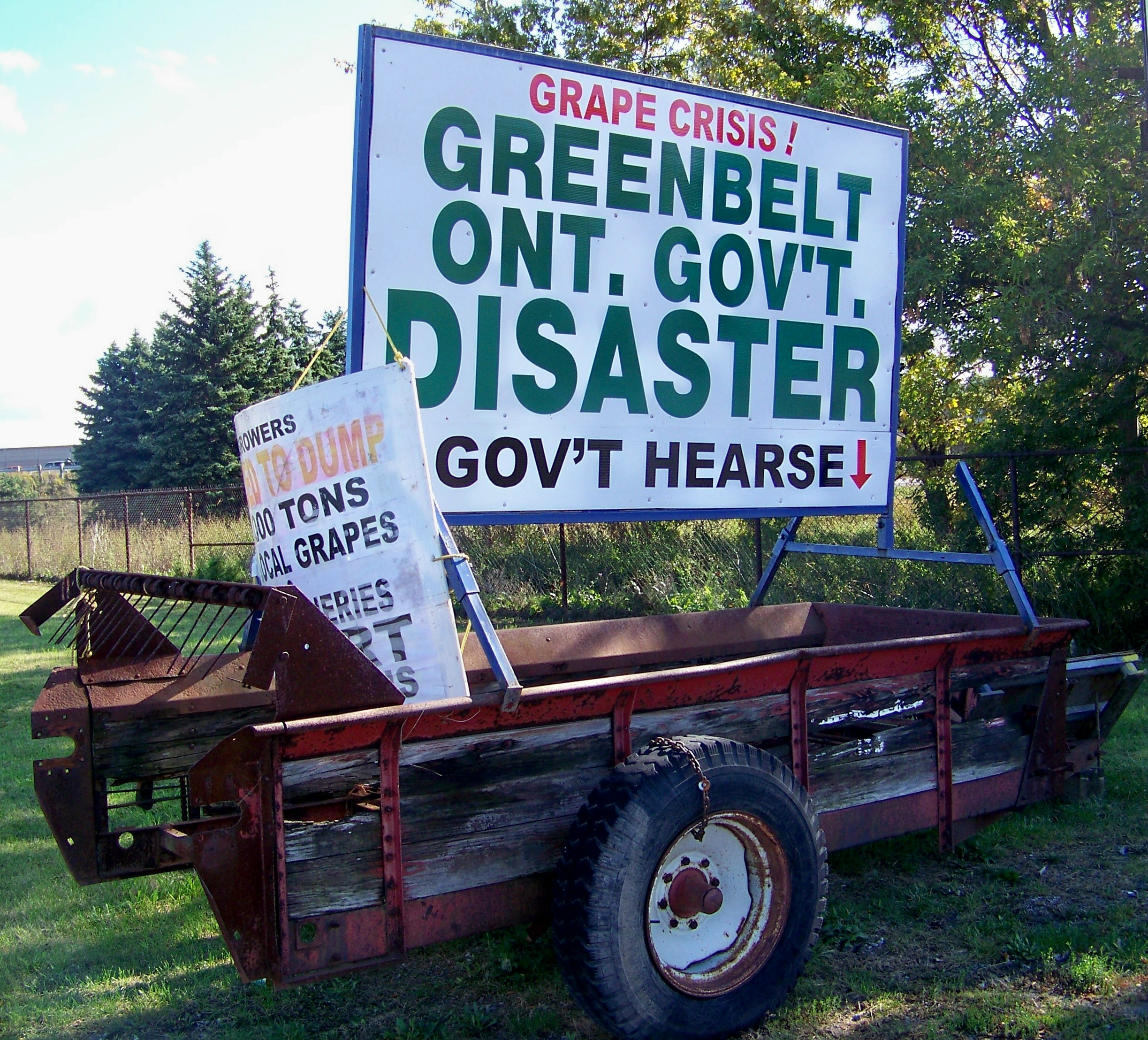 Niagara grape growers displayed this sign in St. Catharines, Ontario last fall. On the side it says - "growers forced to dump 15,000 tons of local grapes while wineries import 40,000 tons." Photo by Doug Draper