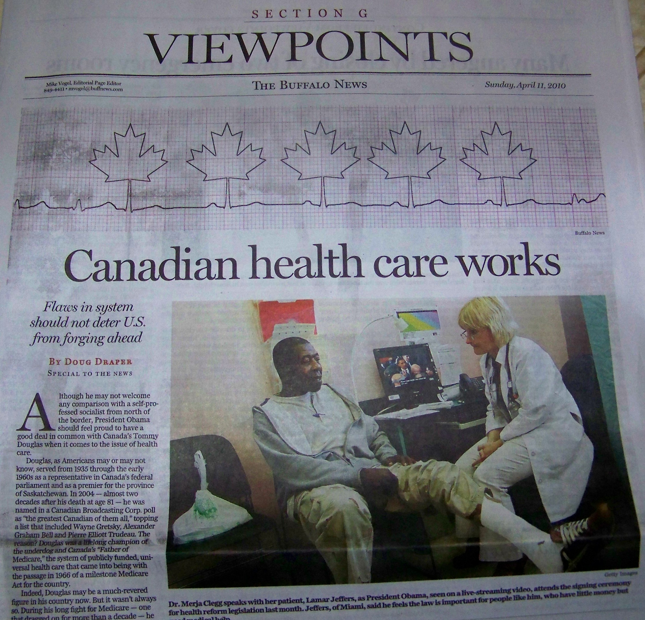 So in the midst of all this, this commentator decided to dive right in and make the comparison between Obama and the late Tommy Douglas, Canada’s father of universal health care, in a column that ran on the front page of the Viewpoint section of The Buffalo News this April 11 – a column you can access by clicking on http://www.buffalonews.com/2010/04/11/1015744/canadian-health-care-works.html