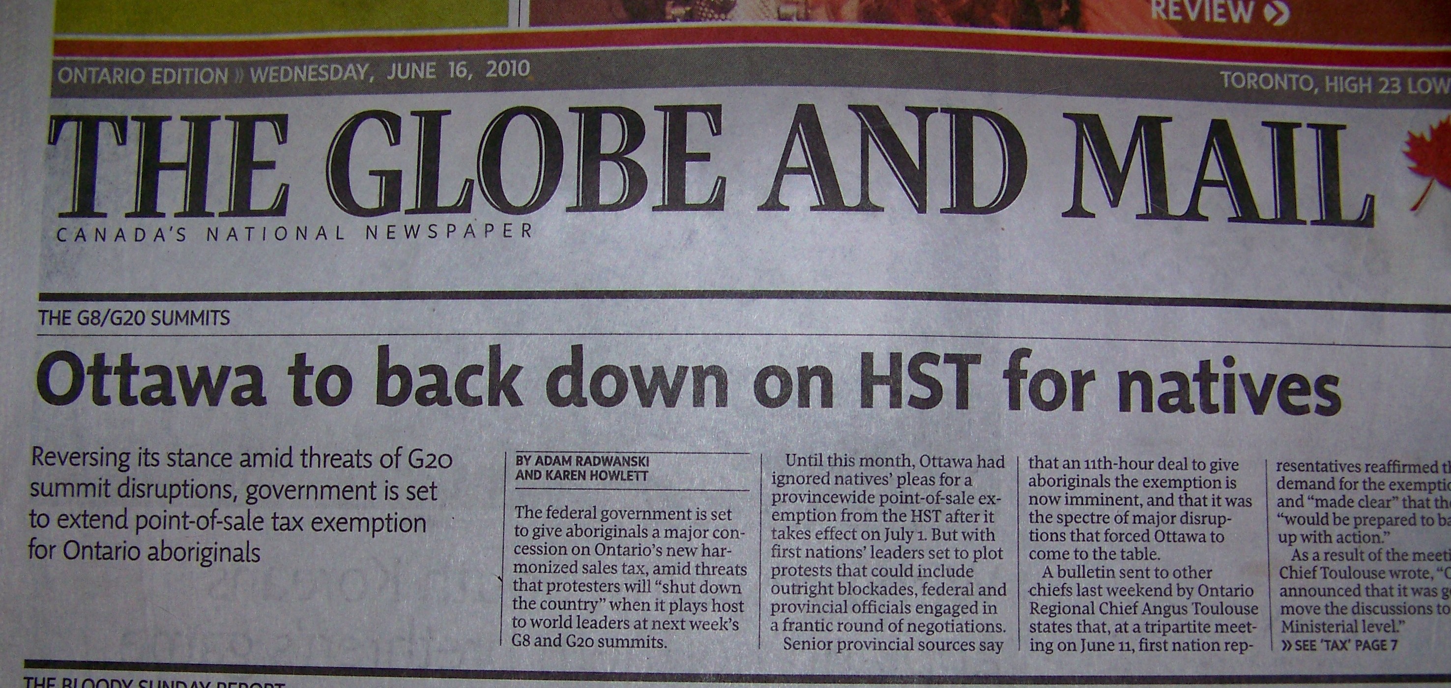 According to this national newspaper, the federal government is now on the verge of extending an exemption to Ontario aboriginals on the much-hated HST due, in large part, to the threats aboriginal leaders have made to take actions that might turn the functioning of the summits into an international nightmare.