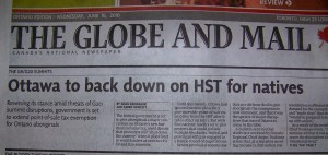 The government does what it wants with NO regard for us! They don’t even represent a majority of the population the way our electoral system is set up. My family has been in Canada for well over 200 years. So what’s the cut-off date for considering us “native” Canadians? I’m not aboriginal but SO WHAT! Why does the government always back down to aboriginals. They surely were mistreated and lied to in the past but now we can be lied to and cheated in the present in the same way but our exemptions just aren’t there. Maybe WE should blockade a few highways. How convenient the HST takes effect when the politicians are on their EXTENDED summer vacation so the furor can die down. I suppose they’ll spend their vacations by the artificial billion dollar lake created for the G8 and G20.