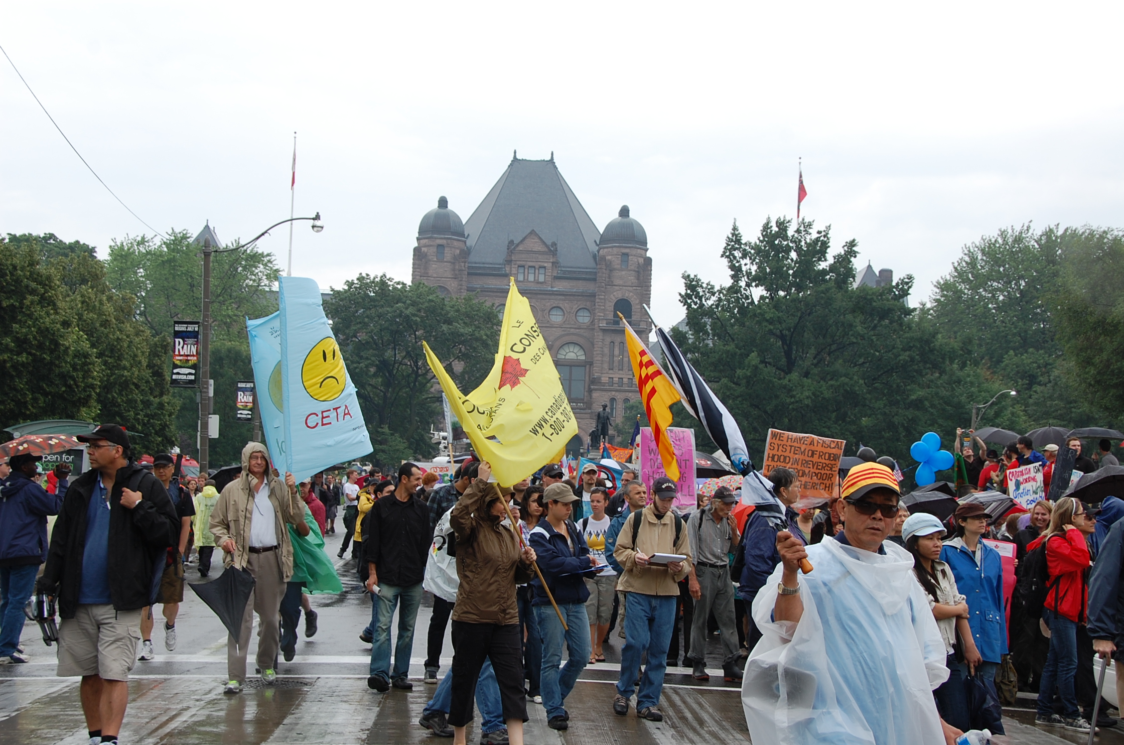 Soon after midday, we assembled with thousands upon thousands of other protesters in Queen’s Park, getting soaked to the skin as the heavens opened. My march with other colleagues and friends from the Council of Canadians, was uneventful – we got back to Queen’s Park in mid-afternoon – about 4:00 p.m. – and then strolled the couple of blocks to O’Grady’s pub on College Street, now full of soccer fans cheering on Ghana against the United States.