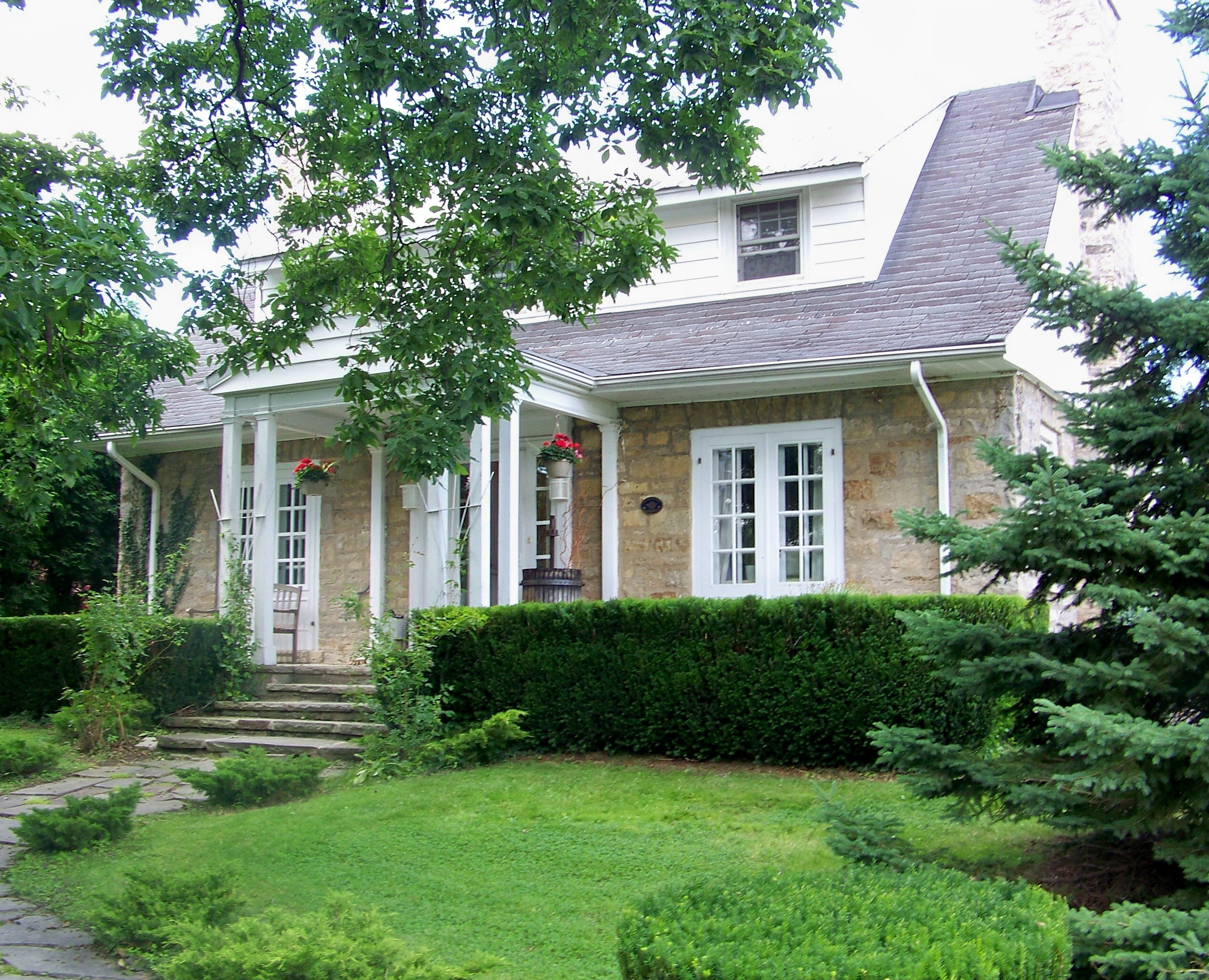This house is unique in its use of stone as the building material for the first storey. The French doors flanking the central front door are more typical of Victorian or Regency Cottage styles, while the porch, portico and entranceway are Neo-Classical. The house is constructed of limestone which came from the ruins of the roadhouse which once stood at the intersection of Beaverdams and DeCew Roads. The upper part of the house is clad in siding with stone chimneys on either side of the house.