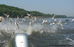 Asian carp leap in the wake of a motorboat in the upper reaches of the Mississippi River watershed. Photo from United States Geological Survey