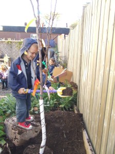 Students at Maple Crest Early School in Fonthill help Welland 10-10-10 plant a pear tree in the school’s garden at a global work party to bring attention to the need to take meaningful action on climate change.