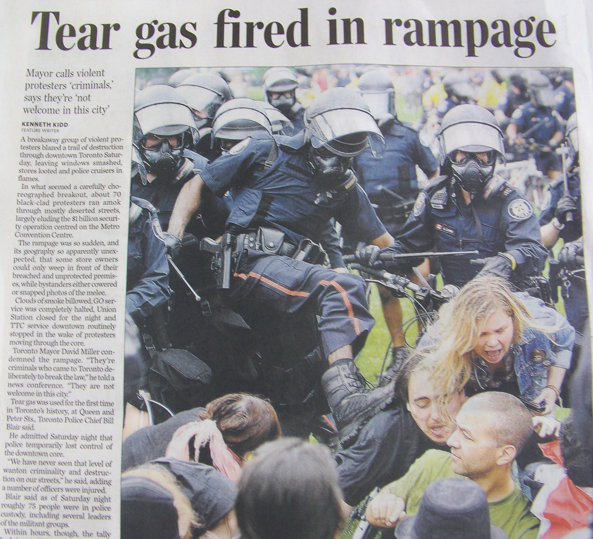 This photo and story of demonstrators being trampled by police appeared late last June in The Toronto Star.