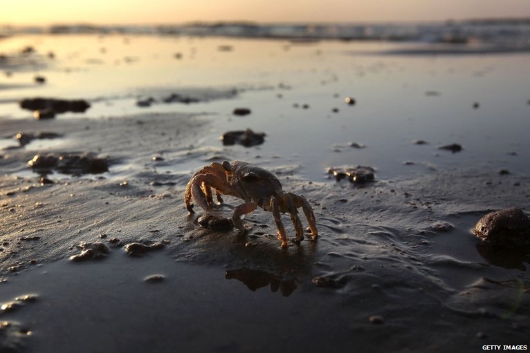 A crab some of us might normally enjoy eating, smothered in BP oil down on the gulf. And BP is getting away with it!