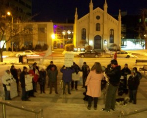 About two dozen Niagara area residents braved bone-chilling temperatures to attend the “solidarity rally,” organized the day before by the Niagara Coalition of Peace (a group Howard-Azzeh is a member of) as a prelude to possibly more local demonstratons of support for the people of Egypt in the future.