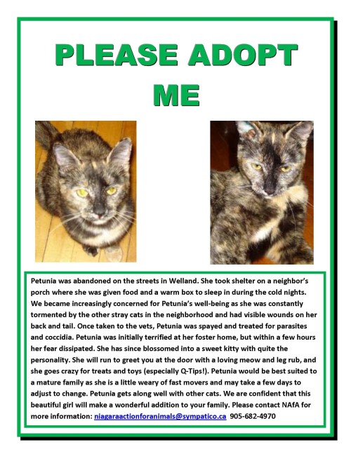 The not-for-profit group Niagara Action for Animals has circulated a poster for a young cat in desperate need of a loving home and Niagara At Large is publishing it below, with all the information someone looking for a feline companion needs to adopt this kitty.