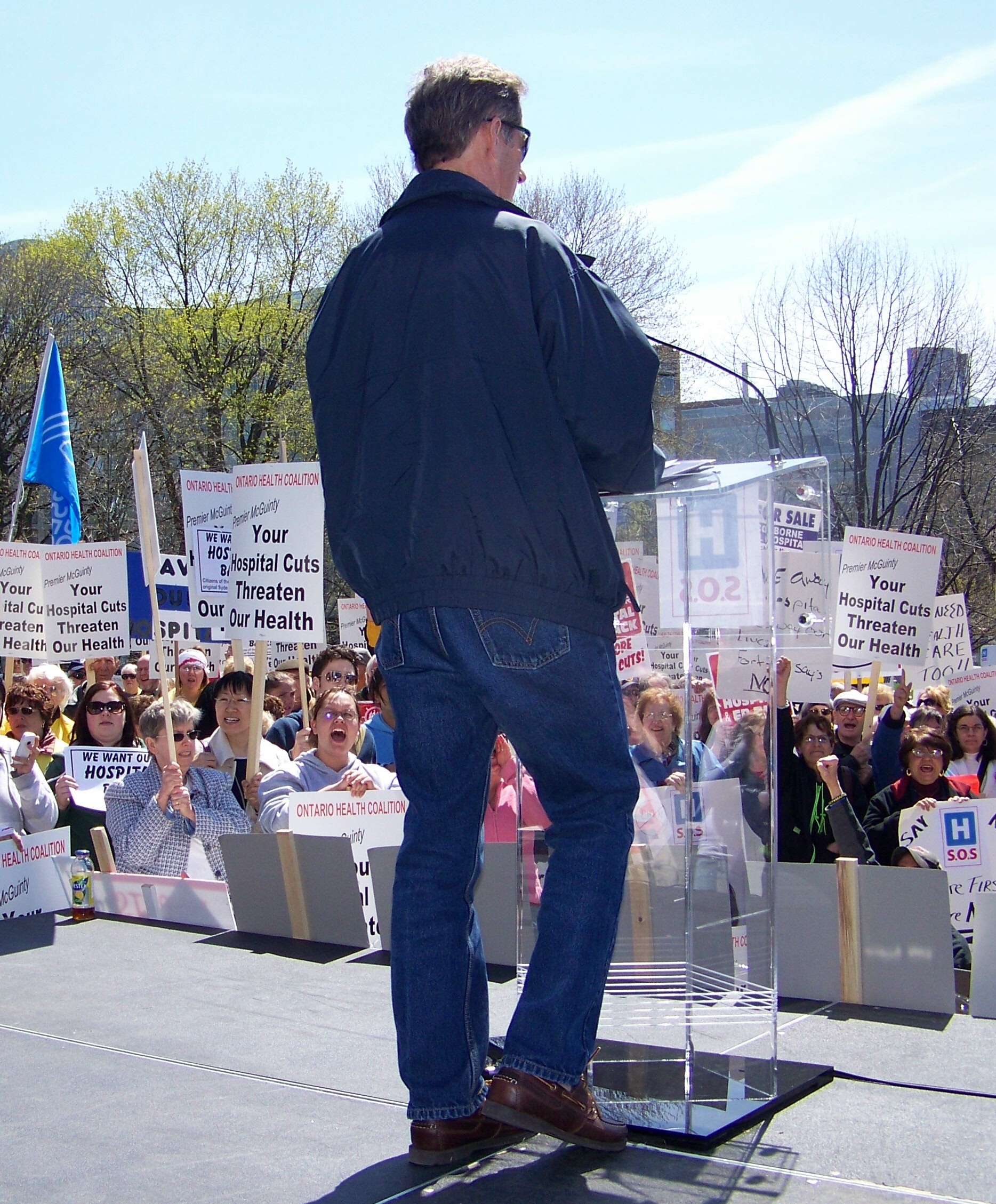 Wayne Redekop addresses rally for better hospital care at Queen's Park last year. Photo by Doug Draper
