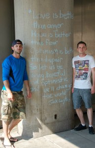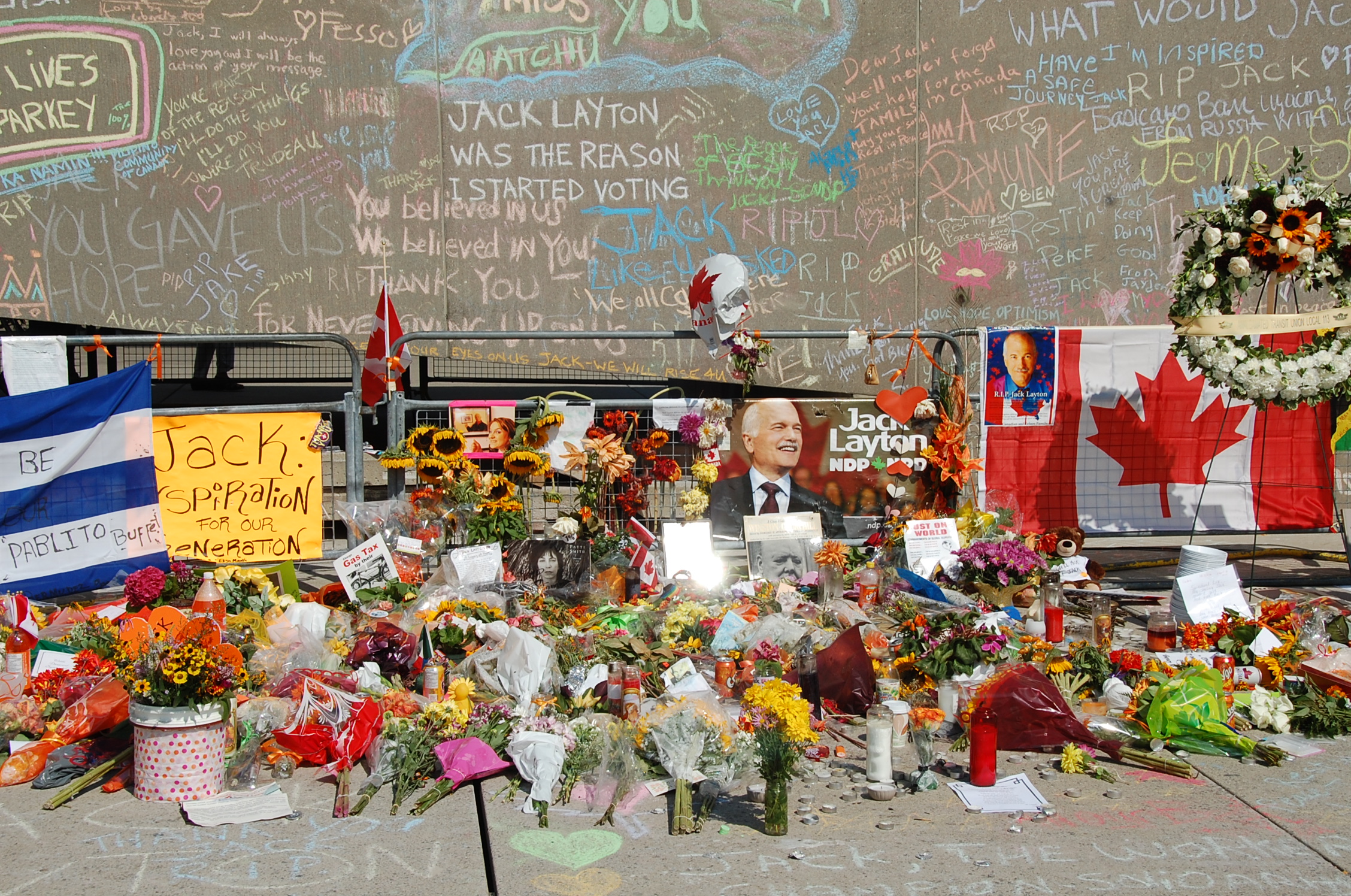 In the first photo, the words; ‘Jack Layton was the reason I started to vote’ are written in chalk on a wall behind a makeshift shrine of flowers. In the same photo, one sign reads; ‘Jack – Inspiration for a Generation’.