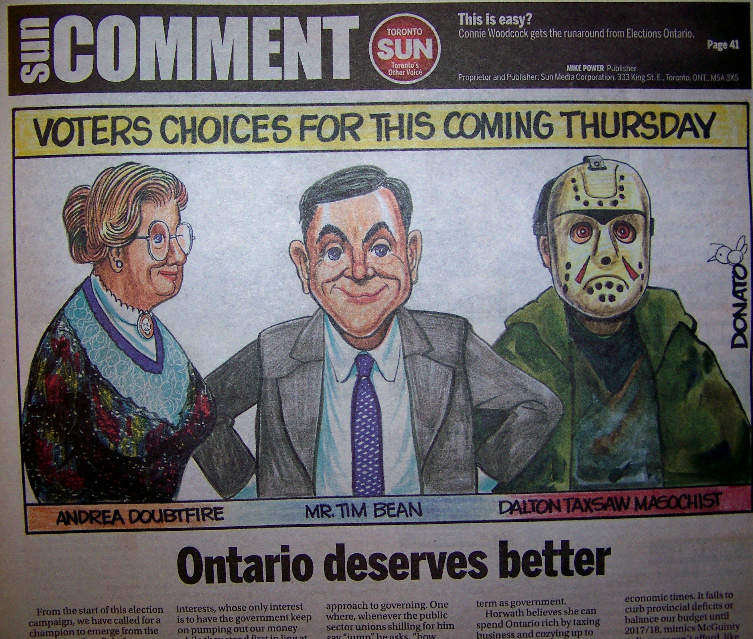Over a headline reading: “Ontario deserves better,” The Sun ran cartoon images of the NDP, Conservative and Liberal leaders respectively, identifying them as “Andrea Doubtfire,” “Mr. Tim Bean,” and “Dalton Taxsaw Masochist.”