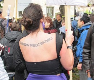 After absorbing a few ground rules intended to keep things peaceful and respectful, we started to walk along Adelaide, to our destination (only just now revealed to us): St. James Park, on the corner of Jarvis Street. As we walked, the difference between this and last summer’s G20 march struck me. That was an “us and them” affair; we marched under banners identifying us as part of this or that group, past curious on-lookers, down streets lined with hundreds of security personnel in riot gear, staring at us through lowered visors.
