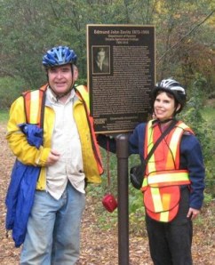 John Bacher and wife Mary Lou pose in front of a plaque for Edmund Zavitz as they retrace his historic 1905 ride through southern Ontario.