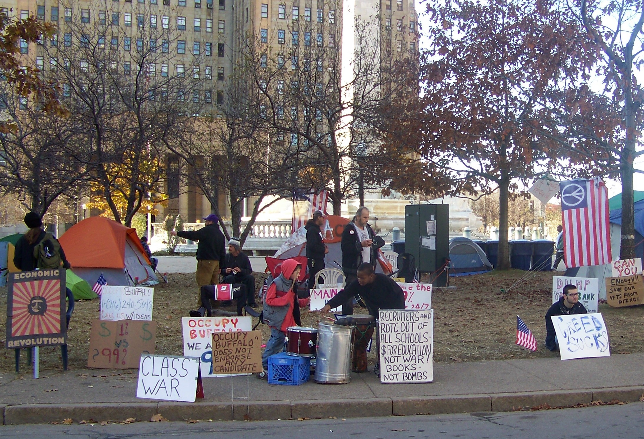 During a short visit this November 5 to the encampment for Occupy Buffalo, located on Niagara Square in front of Buffalo, New York’s majestic city hall, this Niagara At Large reporter was told by some of the protesters that things are still going fine with the city.