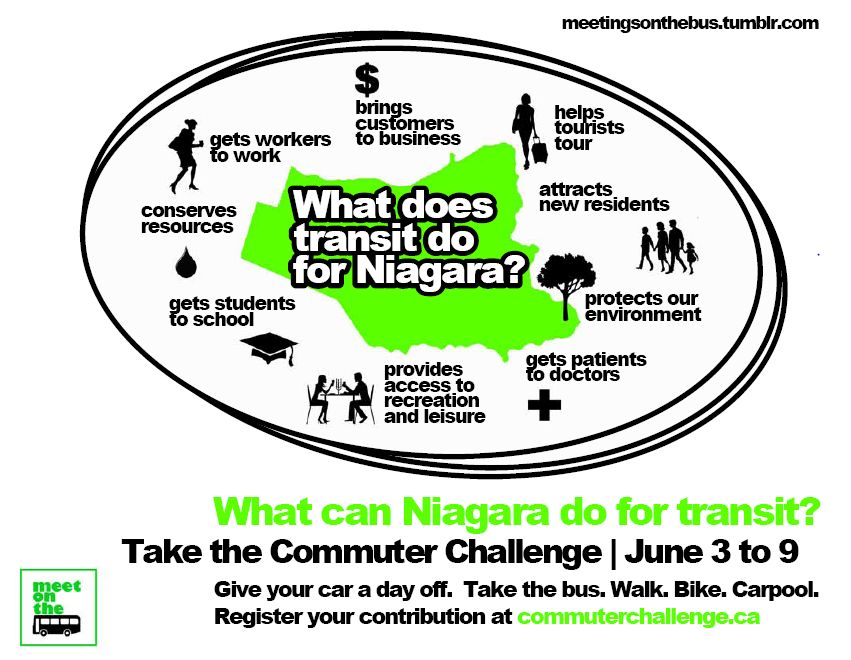 Local not-for-profit organizations and groups, including Meetings on the Bus, Niagara Prosperity Community Committee, Bridges Community Health Centre, Port Cares and Niagara Falls Community Health Centre have come together to promote the commuter challenge in Niagara.