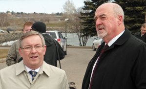 Ontario Environment Minister and St. Catharines MPP Jim Bradley and Thurder Bay, Ontario Mayork Keith Hobbs earlier this year, while Bradley was on a consultation mission around a new environmental protection act for the Great Lakes.