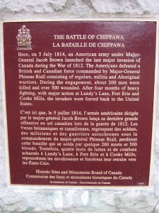 Fought on July 5, 1814, the Battle of Chippawa was the opening engagement of the Niagara campaign, the longest and bloodiest military operation of the War of 1812. A memorial service is held on July 5 each year to commemorate those who fell in service of their nation – this pivotal battle cost the lives of about 200 American, British, Canadian and native warriors allied to both sides, most of whom are thought to be buried at the site. The Battle marked the first time American regulars faced British regulars in a stand-up military action fought in the open and many historians cite Chippawa as the birthplace of the modern American army.A focal point of the Battlefield Park is the memorial cairn, dedicated to the memory of the regiments and First Nations warriors who fought in this battle. The cairn is also meant to commemorate and celebrate the peace that has prevailed between Canada and the United States since that time. The monument is constructed of dolomite limestone donated by Fort Niagara (Youngstown, NY), another key site in the War of 1812. ![chippawa plaque]](https://niagaraatlarge.com/wp-content/uploads/2012/07/chippawa-plaque.jpg?w=225&h=300)