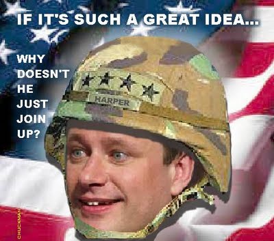 “Canada, formerly respected throughout the world as a nation of peacekeepers and diplomats, succumbs to jingoist overtures from a militant P.M who seems oblivious to the realities of illegal warfare …”