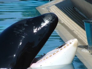 One of Marineland’s ‘killer whales’ – more known as ‘orcas’ in the wild – up for a reward of food at entertainment time. File photo courtesy of Zoocheck Canada.