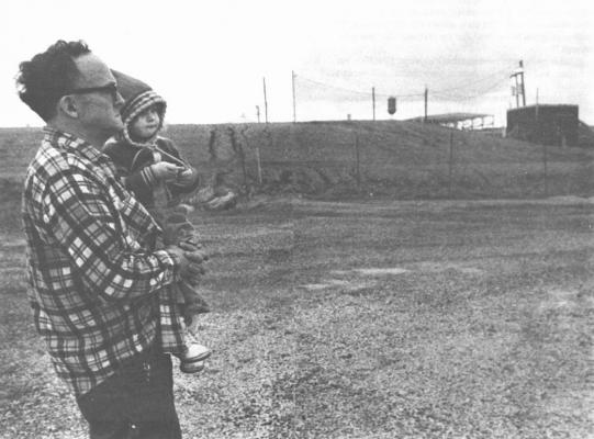An old file photo of Fred Armagost and a grand-daughter with the Hyde Park dump looming in the background. Armagost gave this reporter, Doug Draper, a tour of the poisoned lands around the Hyde Park site in 1980 and shortly before his family was forced to abandon their home. In this photo, Armagost is overlooking a creek, called Bloody Run, that washed dioxin and other toxins from the dump down the face of the gorge to the Niagara River and Lake Ontario. If and when the cleanup structures built around this dump break down, could these poisons beging flushing their way to our shared American-Canadian waters again?