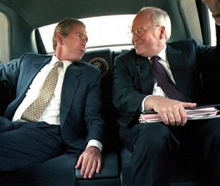 George W. Bush consults with his brain, Dick Cheney. Both men, who managed to avoid fighting in the Vietnam War decades earlier, have declared that they have no regrets about the Iraq War.