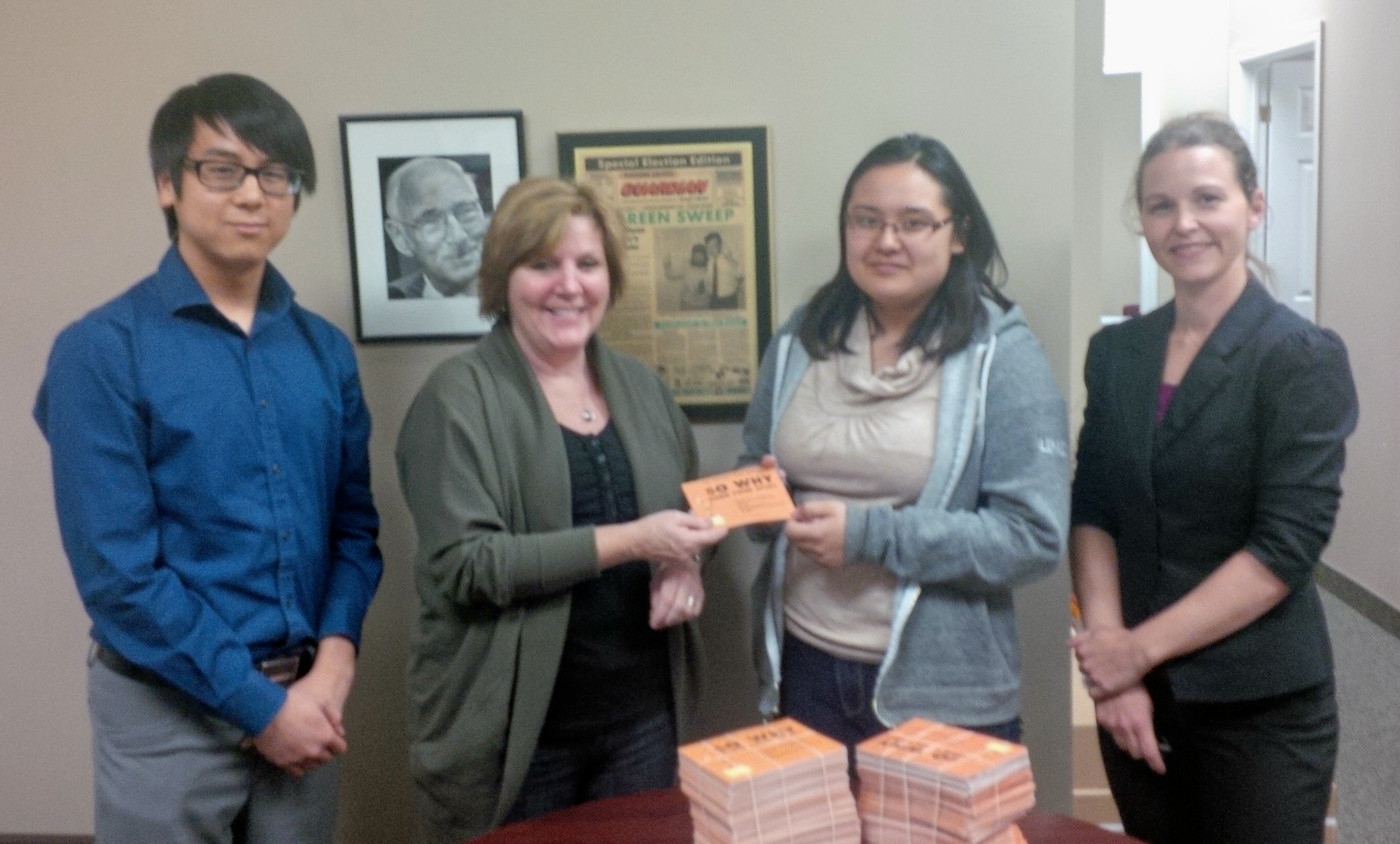 The pic L-R has David Nguyen (Brock Student) Cindy, Sarah Lukaszczyk (Gr. 12 student at Notre Dame) and Karen Babcock, Health Promoter at Niagara Region Public Health who presented over 2,500 post cards to Cindy on the provincial bill dealing with tanning beds and there support for the bill originally brought to the house by France Gelnas, NDP Health Critic.