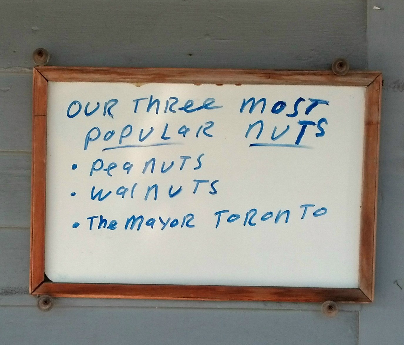 In the middle of all of this, a friend in our Thanksgiving gathering, Claudia Farber from New Jersey, said that she had a photo image she wanted to share with me that she took at a very popular shop on the Cape called the Birdwatcher’s General Store. The image was of a white board outside the front door of the store where the following words were scrawled; ‘Our three most popular nuts – peanuts, walnuts, the mayor Toronto.’