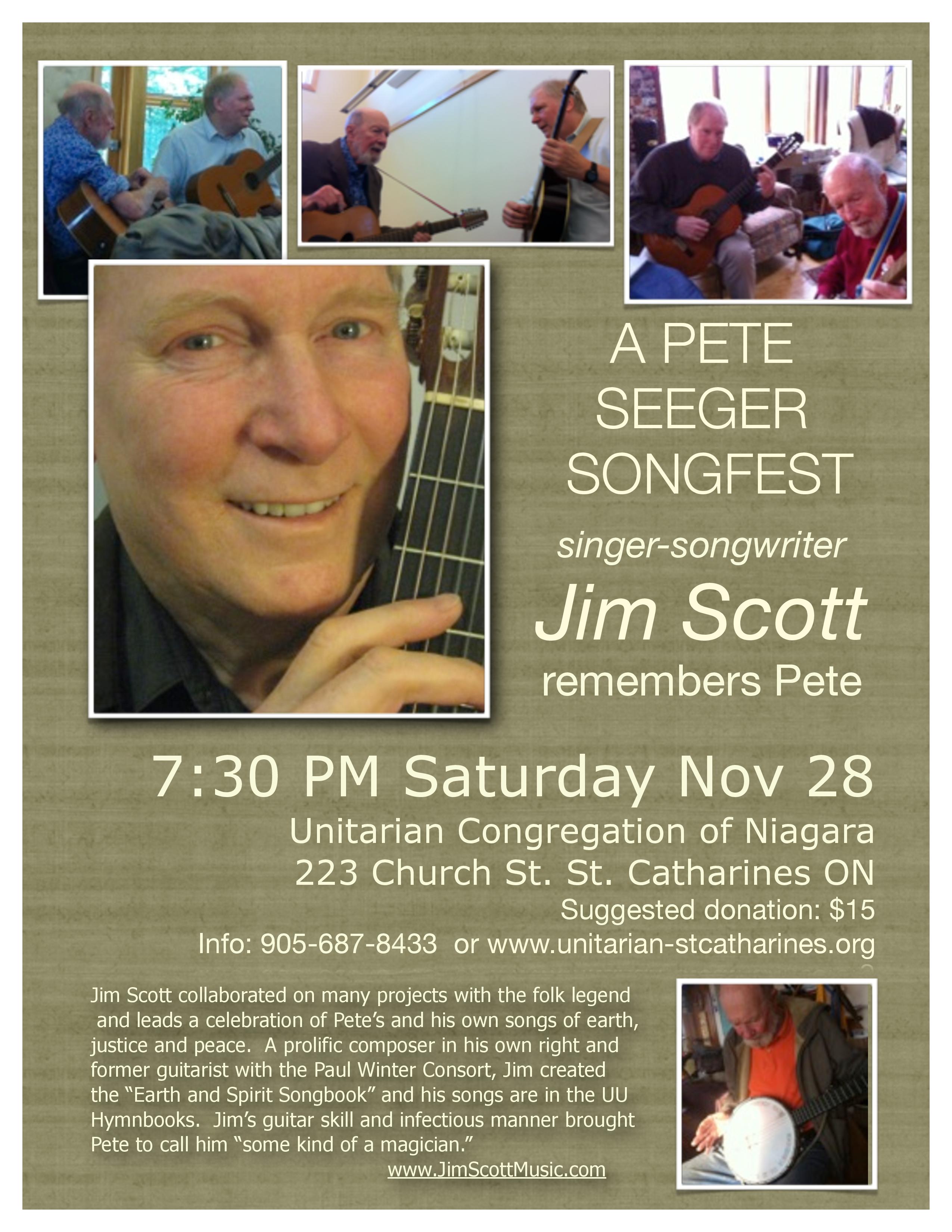 Saturday, Nov. 28, 7:30 pm. at the UCN at 223 Church Street in the Niagara, Ontario City of St. Catharines. You are invited to a Pete Seeger songfest with singer-songwriter Jim Scott – suggested donation $15 at the door.