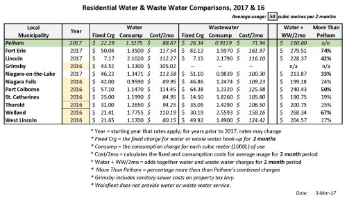 I reviewed the most up-to-date rates and calculated the fixed charges and the rates for both water and waste water for Pelham and for the other local municipalities. At $161 for two months (for the average residential use of 50 cubic metres) Pelham leads the pack with the lowest combined water and waste water charges!