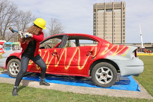 Brock University Student Life and Community Experience marketing assistant Nicole Henderson (pictured immediately below) takes her turn at the Charity Car Smash held in front of Schmon Tower at Brock on Wednesday, March 29.