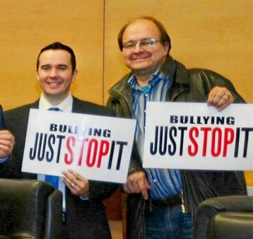 Port Colborne regional councillor David Barrick and St. Catharines regional councillor Andy Petrowski pose in the council chambers a few years ago for a campaign launched by a community group to stop bullying everywhere.