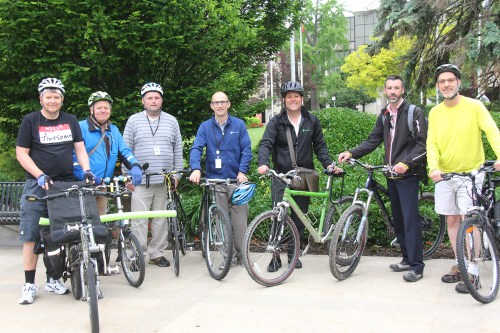 The City of St. Catharines kicked off Bike to Work Week today and is encouraging residents to discover the many benefits of active transportation by turning their daily commute into a healthy activity. Pictured from left are: Peter Warwick, Active Transportation Advisory Committee member, Robert Hillier, committee member, Peter Leyser, City transportation technologist, Rob Lapensee, City corporate communications officer, Mayor Walter Sendzik, Brian Applebee, City manager of transportation services, and David Wyllie, committee member. Photo courtesy of City of St. Catharines, Ontario