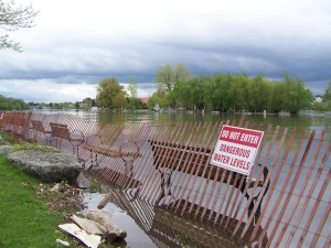 This spring’s flooding waters threaten shoreline properties in Port Dalhousie in Niagara, Ontario. Communities around Lake Ontario and other areas of the Great Lakes have continued to suffer damage from unusually high waters this spring. Photo by Doug Draper