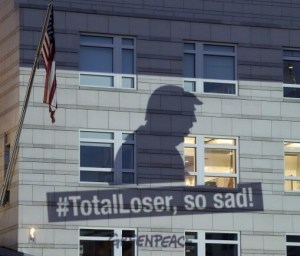 The international environmental group Greenpeace projected this image on the U.S. embassy headquarters in Berlin, Germany this spring after Trump announced his intentions to back away from the Paris climate agreement.