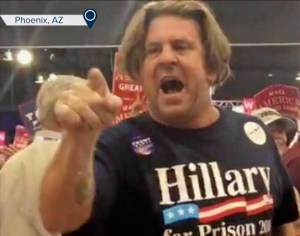 A Trump supporter at the Phoenix rally, still sporting one of those all-too-popular ‘Hillary for Prison, 2016’ t-shirts, jabs a finger at “the enemy of the people” – the “lyin” American press Trump accuses of not loving their country.