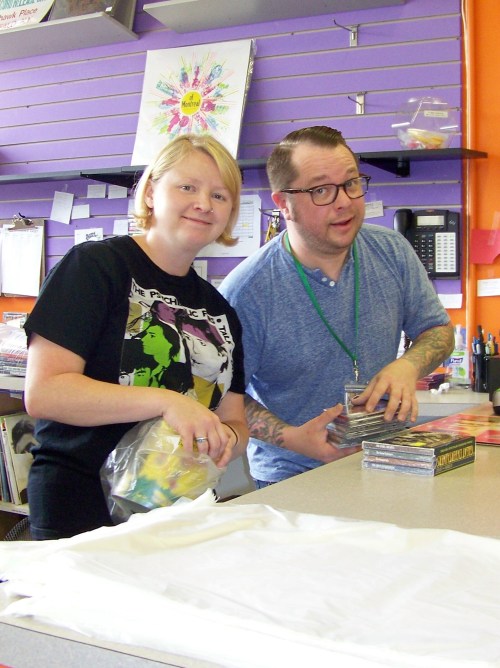 Nikki and Andrew, two of the Record Theatre employees that gave this great store its heart and soul, … emotional but smiling as they ring in sales on what, for now at least, was the Buffalo store’s final day. Photo by Doug Draper