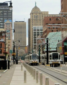Metro rail transit cars gliding through downtown Buffalo, New York