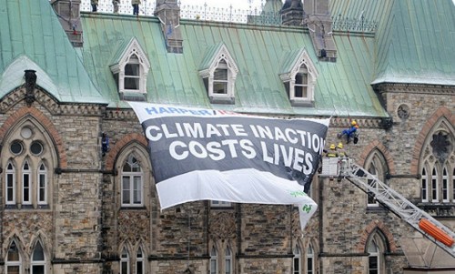 Greenpeace protesters place this banner on side of West Block building on Ottawa’s Parliament Hill in 2009
