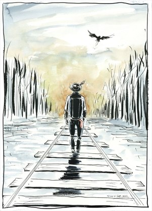 Jeff Lemire took the image he had drawn of the young boy on the tracks for the Secret Path project and replaced him with Gord Downie walking away from us, as one way of honouring him following his death. This moving image has been posted by the artist on Facebook, and if you are a fan of Gord Downie and have not yet seen it, I am reposting it here.