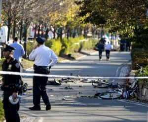 Mangled bicycles on a trail in New York City where an attacker in a truck mowed people down, killing at least eight.