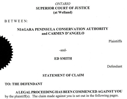 Top of the first page of the legal document Niagara, Ontario citizen and community activist Ed Smith was issued last winter when he was slapped with a defamation suit following questions and concerns he raised about the way the Niagara Peninsula Conservation Authority does business with millions of our tax dollars. Smith’s lawyer argued in court this November 21st that Smith, a retired Canadian Armed Forces officer, was exercising his right to free speech and acting in the public interest.