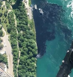 An aerial view of the massive July 29th discharge from a Niagara Falls, New York wastewater treatment plant that darkened the waters of the Niagara River just downstream from the Horseshoe and American Falls.