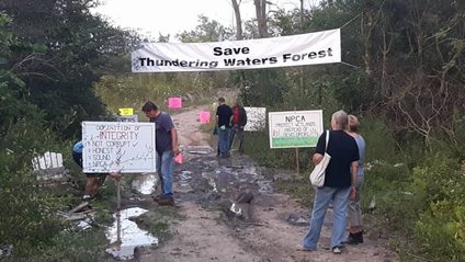 Blog photo of environmentalists protesting a planned development in Thundering Waters Forest in Niagara, obtained from CBC News website.