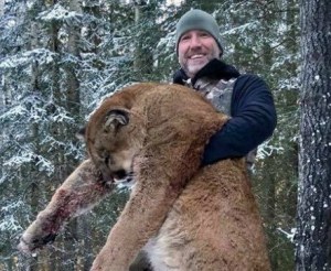 Canadian TV show host Steve Echlund proudly displayes the cougar he blew away early this December 2017 in Alberta, where one tar sand-loving premier after another continues to let this killing be legal.
