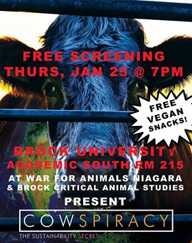 Niagara, Ontario – You are invited to a a free screening of ‘Cowspiracy’ scheduled for Thursday, January 25th – 7 p.m. at Brock University – Academic South, Room 215 sponsored by At War for Animals, Niagara & Brock Critical Animal Studies.