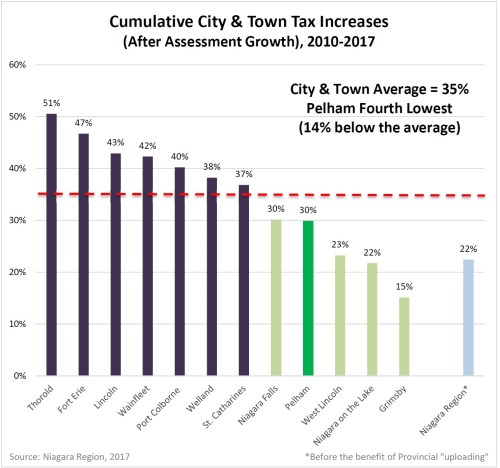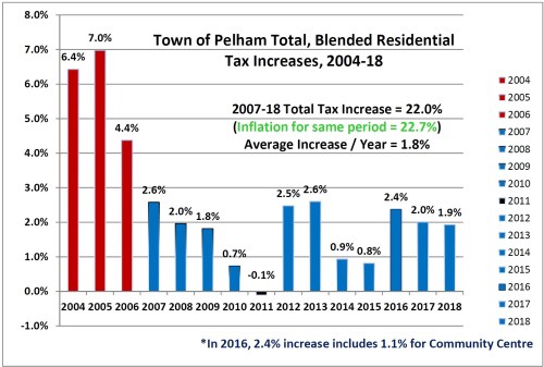 Pelham, Ontario – If you pay your property taxes by installments, you will know that the second installment of your 2018 property tax bill comes due in two weeks (April 30). With this deadline approaching, I wanted to tell you about Pelham’s 2018 blended residential property tax increase – at 1.9% – and also to compare with other Cities and Towns.
