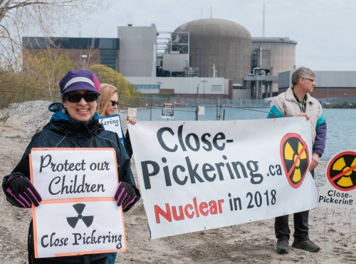 Meanwhile I would love to know what the lady with the placard is protecting her children from. As the article correctly points out Pickering has been around for a long time and has done no harm. And it goes on producing some of the provinces most valuable power.